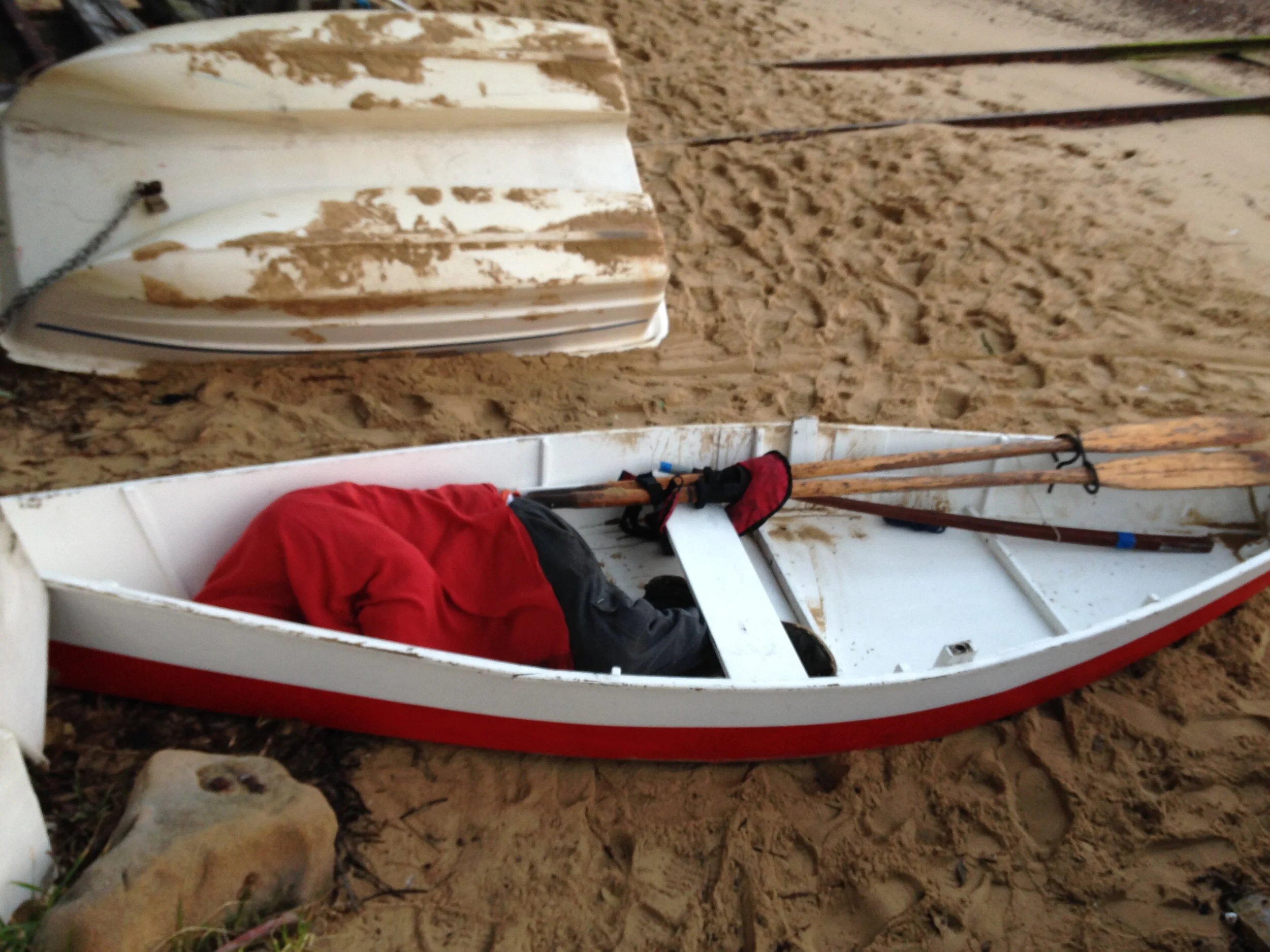 One morning I went down to the beach and discovered that someone had turned my boat upright. This was one of those situations where one cannot quite work out what their eyes are seeing, but, with each step one takes, it becomes a little clearer. As I got closer it seemed that someone had put some sail covers in my boat – red covers. That seemed a bit odd. It wasn’t until I was right beside the boat that I realised that the covers were actually clothes – a jacket and pants – and there was someone wearing them, asleep. What a shock for an early morning. It didn’t take me long to wake up the vagrant. However, it took a bit of convincing for him to realise that I wasn’t going to let him continue sleeping, despite his pleas! I explained that I had to get to work. That morning I had the strange displeasure of rowing to work with the feint smell of urine accompanying me. I could only laugh at the situation. With a degree of pride I realised that, to at least one person, my boat looked like the most comfortable boat on the beach.