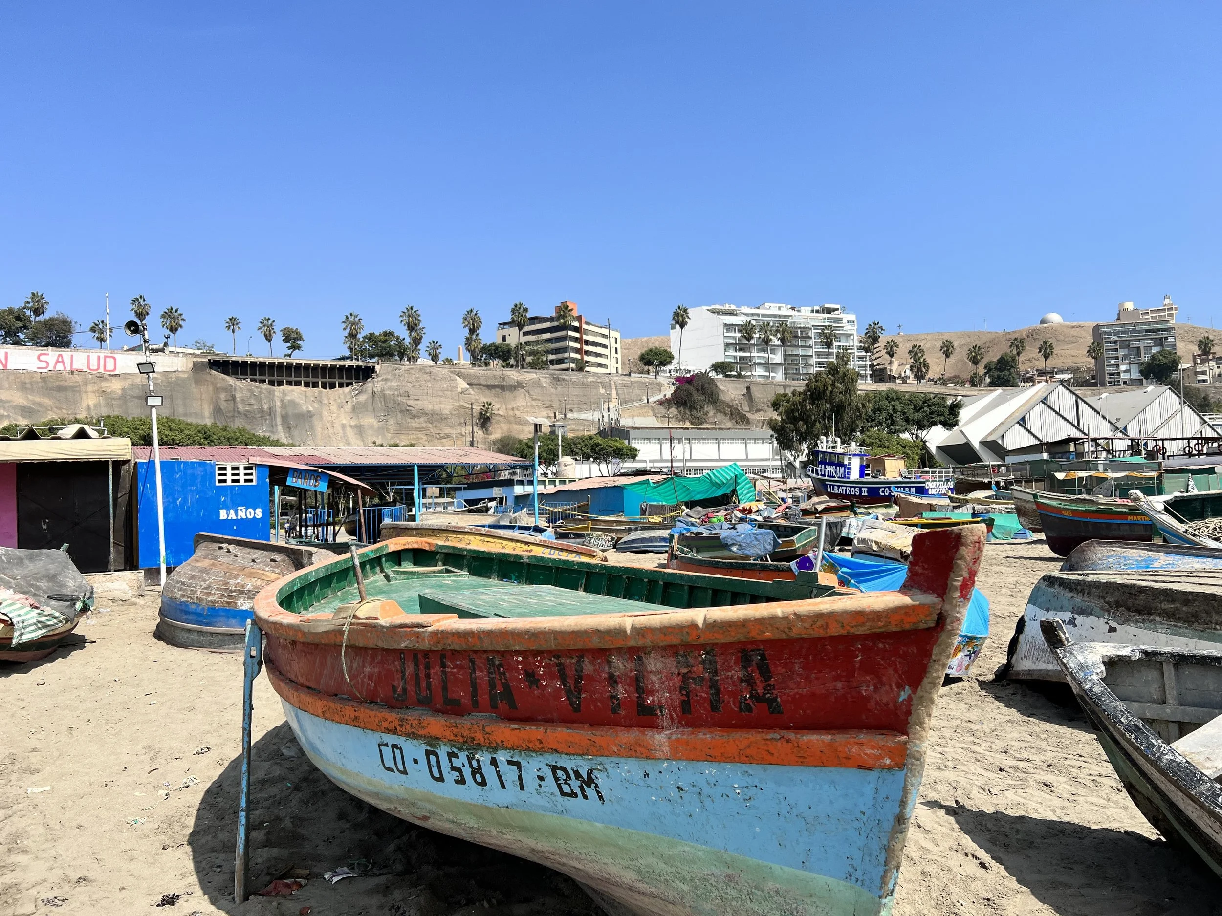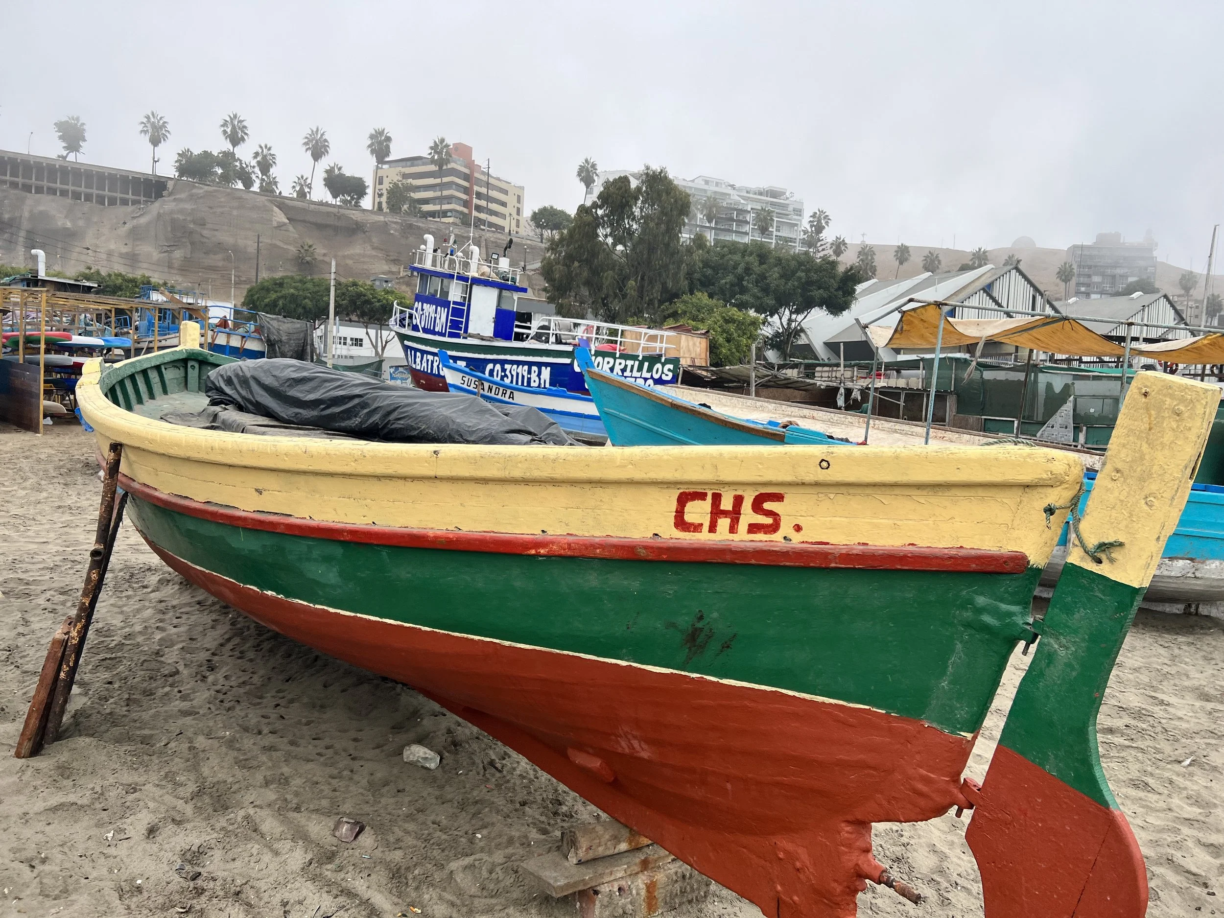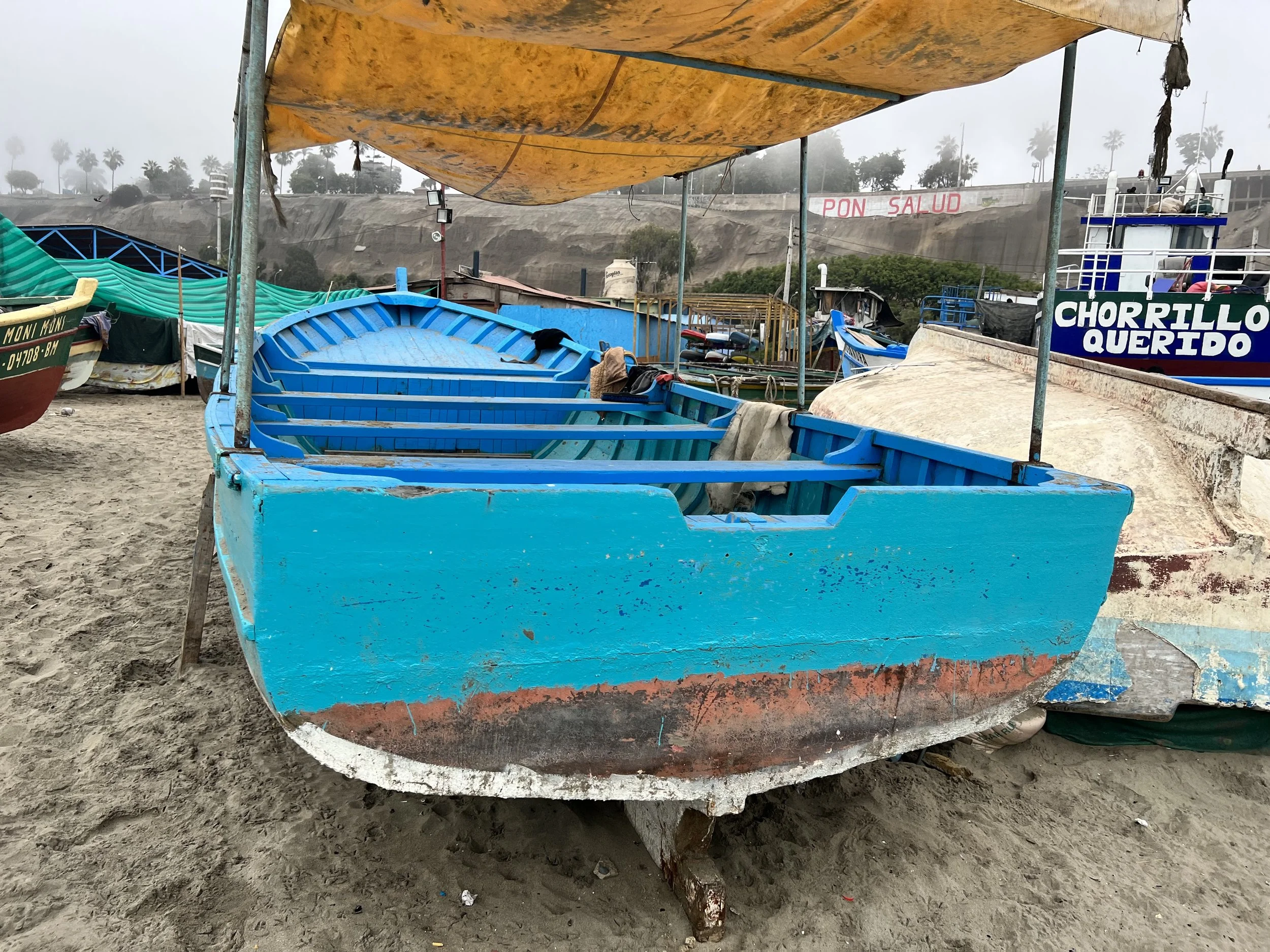 Once she was far enough up the beach, nestled amongst the fleet, the rudder was put under the gunwale on the port side, and an oar was stood vertically on the other, lashed to the thole pin, keeping the boat upright. Here she will sit for a time while the owner scrapes and paints her bottom, maybe some work on her engine and perhaps replace a plank here or there. No doubt she will be back out on the water as quick as she can, earning her keep on the coastal waters of Peru. These boats are as picturesque as one could hope to find on any beach around the world. Where I live these boats haven’t been working common for close to 100 years. But not Peru, here they still proudly motor out each day to make their living. What a joy it is to experience such a beautiful working craft.
