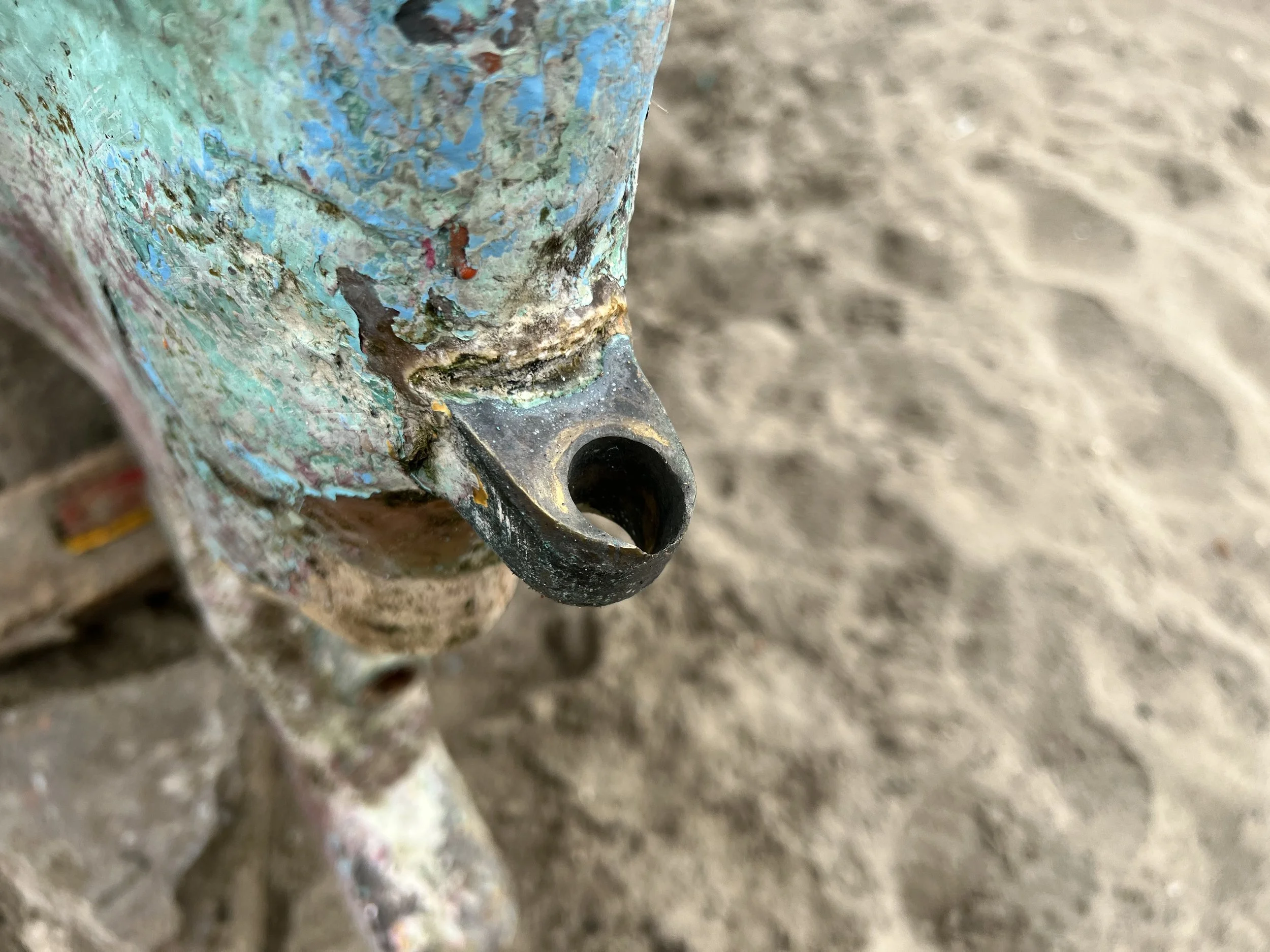 The rudders on these boats are a simple affair, hinging on two bronze gudegons. On all the double enders I saw, the top gudgeon was in fine condition, while the lower was very heavily worn. This is due to the lack of support where the heel of the rudder comes close to the end of the keel. This leaves a large unsupported area which is constantly under pressure from prop wash. So, naturally, the bottom gudegon wears at a great rate. Aside from these gudegons, there seems to be a complete lack of metal hardware on these boats, a cost saving feature for sure.