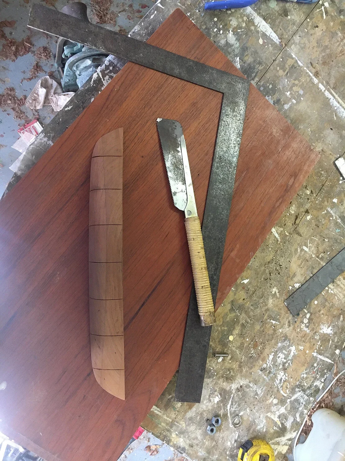 My half model started with a few pieces of Australian Red Cedar 'Toona ciliata' glued together with polyurethane glue. Cedar works easily with a relatively tight and uniform grain. I then roughly drew the sheer in profile, and half breadth views. The bandsaw was then used to cut these two lines. Once I had a bit of a banana I screwed a bit of wood to the inside face and clamped it into the vice. Then begins the gradual removal of timber to the desired shape.