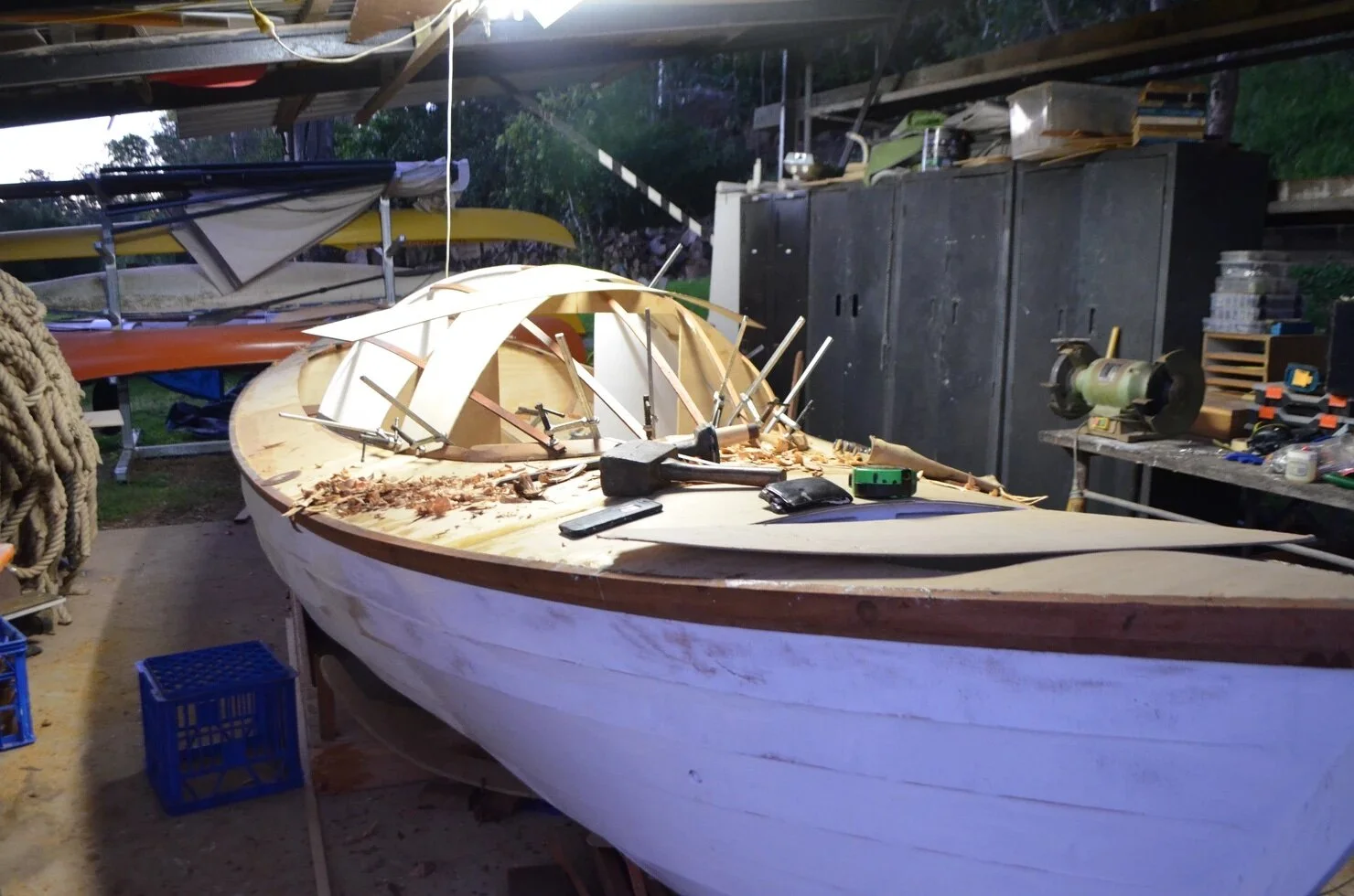 Once it was faired I went inside and removed the temporary mould and the ribbands. I was amazed at how much room there was under that cabin. It's all relative of course, but it felt positively luxurious. Definitely the most room I have ever had in one of my rowing boats.