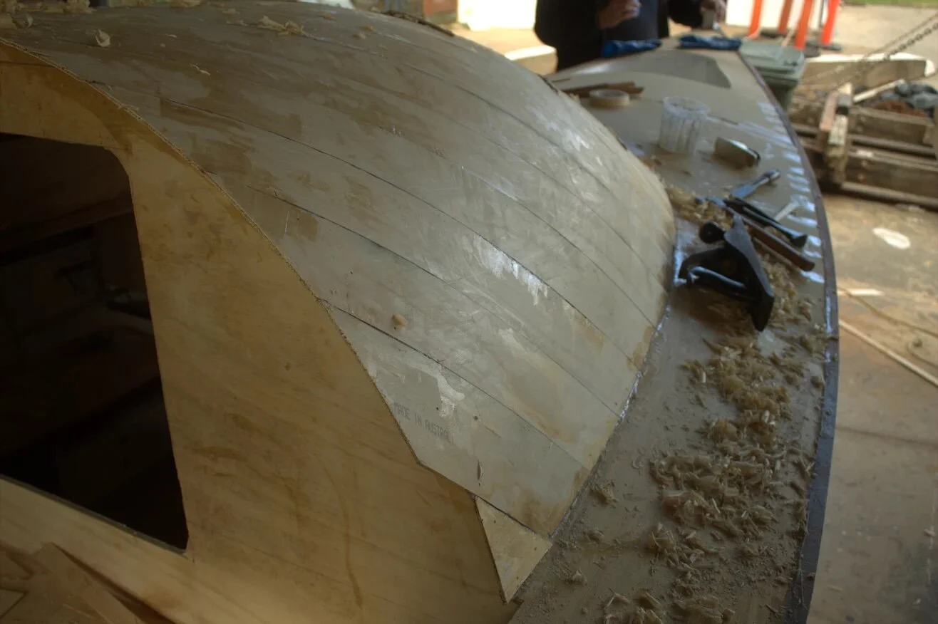 The first layer was fastened with a pneumatic pin gun to the main bulkhead and the cleats. The next layer was temporarily fastened to the first layer, then the small pins were pulled though from the inside, once the glue had gone off. I faired the cabin with hand planes then an orbital sander. No fibreglass was used.
