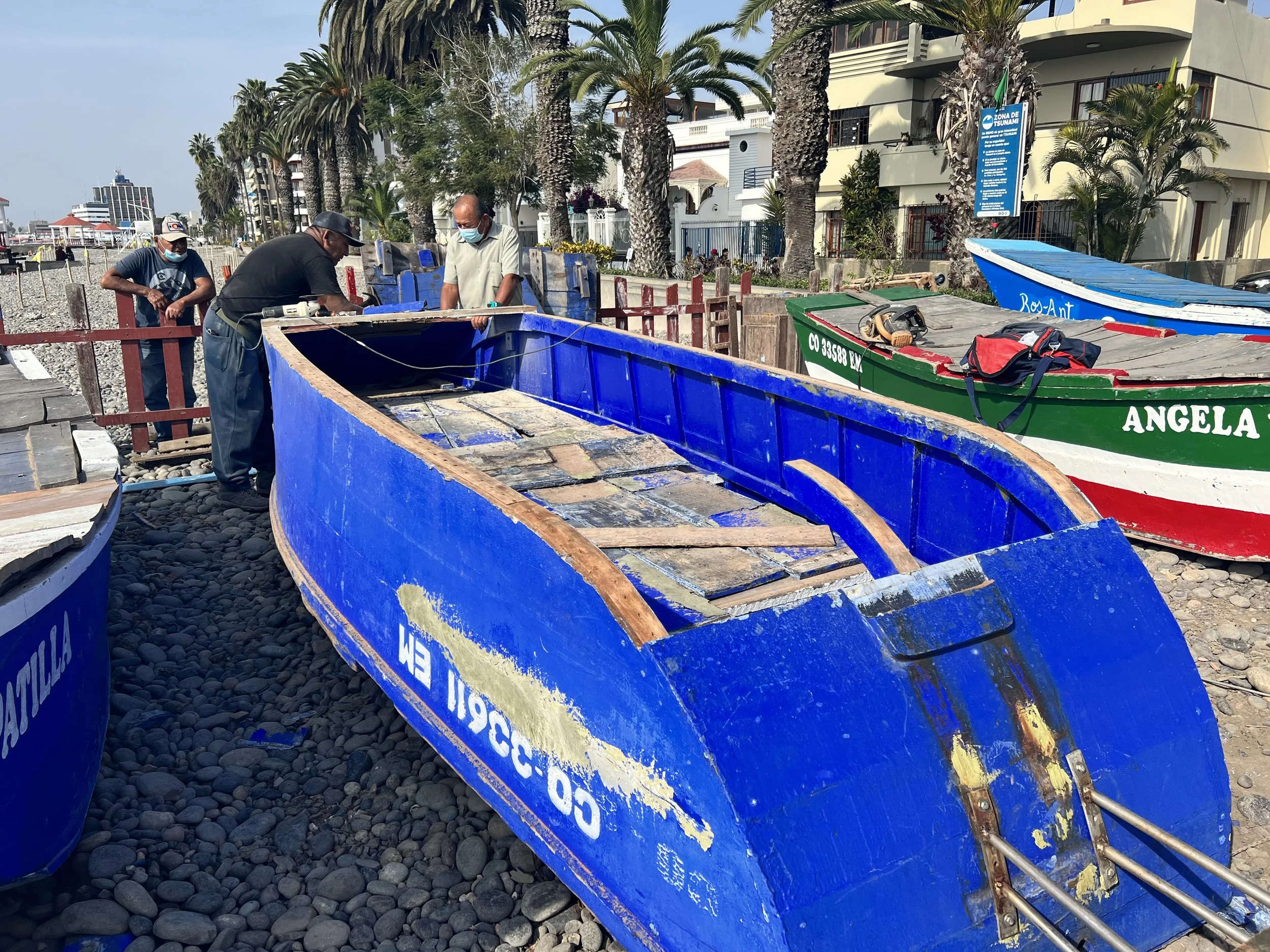 Now we’ll move onto the other small boat in the fishing fleet. The vee-bottom dinghy. This style of craft is ubiquitous in Eurocolonial nations around the world. Seventy years ago in Australia you would have found very similar boats in great numbers, also fishing, just as these ones do. I’m sure the same can be said for North America. Their simple construction and adaptability to many a task make them an ideal fishing boat. This type was the most common on the beach at Chorrillos, outnumbering the other types by two to one.