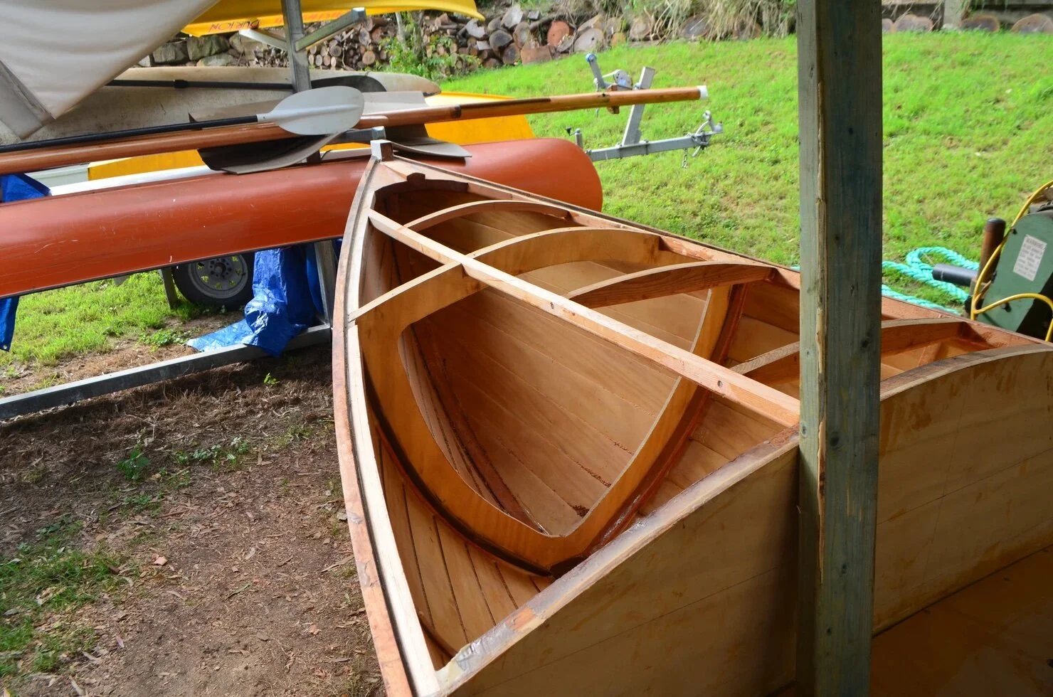 The somewhat different deck framing structure here means that I didn't have to laminate any deck beams on a mould. The two full-width beams were laminated and glued in one operation on the bulkheads. This is a small but handy time saver.